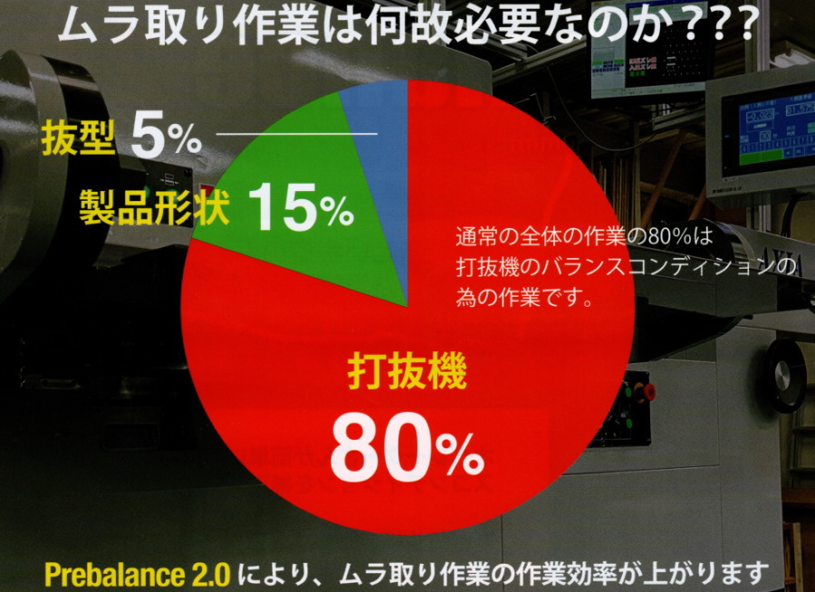 打抜機の準備時間短縮には新型作業時のムラ取り時間を短縮する事は非常に需要です。その為には打抜機のバランス補正が絶大なる効果を発揮します。バランス補正方法では世界で唯一、複層フィルムを使い強いエリア部分を剥がして調整する方法です。